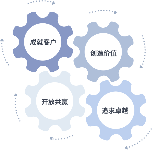 成就客户是一切决策的出发点,,,创造价值是衡量所有工作的标准,,追求卓越是我们做事做人的态度,,,,开放共赢是我们的格局也是最终的结果。。。。价值观的齿轮环环相扣,,,推动着组织里的每个人不断向前。。。